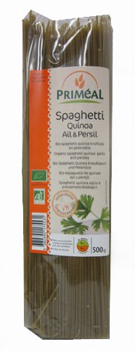Spaghetti quinoa ail et persil, 500 g, de Priméal :Les spaghetti quinoa de Priméal, à la semoule de blé dur et au quinoa (10 %), sont de très bon goût d'ail et de persil !Spécificités du produit :- Naturellement parfumées avec de l'ail et du persil séchés puis broyés justeau moment de leur incorporation à la semoule de blé dur- A consommer de préférence sans sauce- Accompagner d'un filet d'huile d'olive ou d'une noix de beurre.Informations allergènes :- Contient du gluten- Peut contenir des traces d'oeuf- Peut contenir des traces de lupin.Fabriqué en France.Origine :Agriculture UE / nonUE.Contenance :500 g.Certifié Agriculture biologique et Ecocert. Semoule supérieure de blé dur*, quinoa* (10 %), persil*(3 %), ail*.* issus de l'agriculture biologique.Valeur nutritionnelle moyenne pour :- 100 g :Valeur énergétique : 1542 kj soit 363 kcalProtéines : 10.6 gGlucides : 79 gLipides : 0.5 g. Temps de cuisson très court (6 min). Pour un repas de fête vous pouvez disposer sur les pâtes à peine égouttées quelques lamelles fines de saumon fumé et un filet de crème.Conservation :A conserver dans un endroit sec et frais, à l'abri de la lumière.